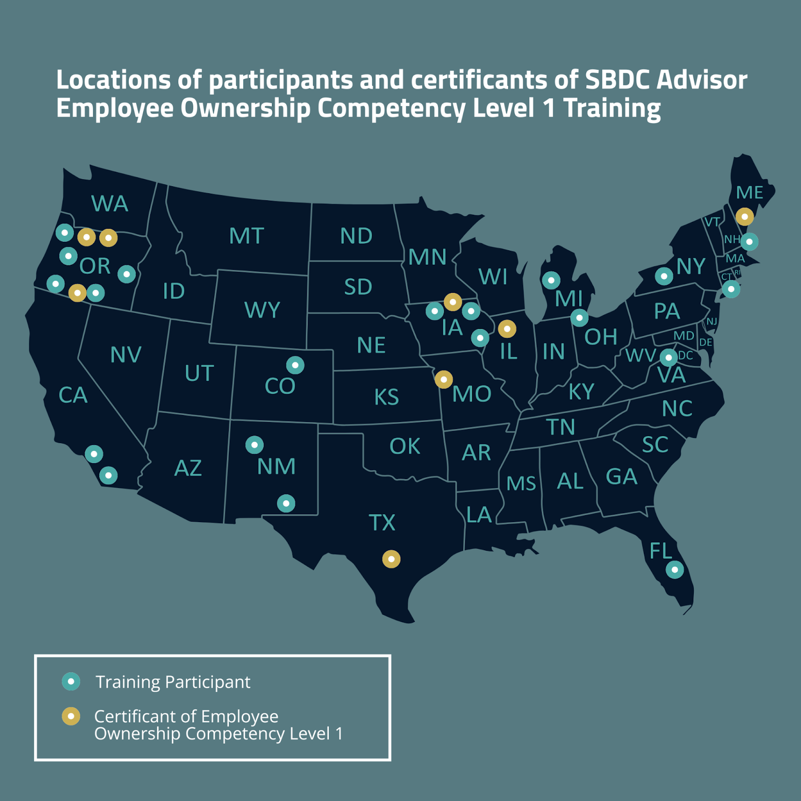 Map of the United States showing the locations of first cohort 2025 participants who completed the SBDC Advisor Employee Ownership Competency Level 1